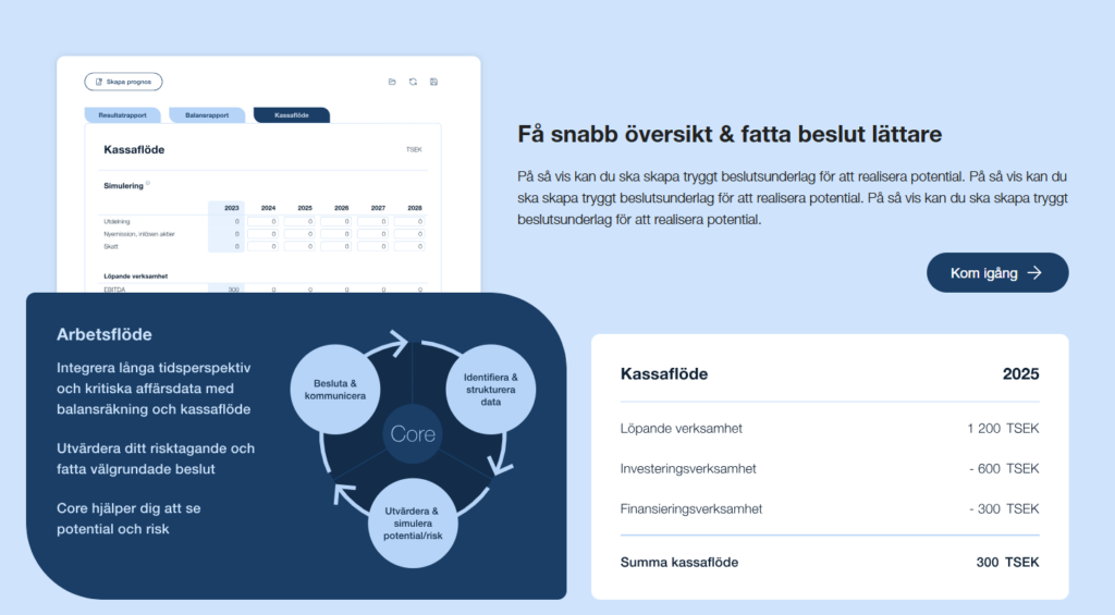 För att fatta rätt beslut idag vill du förstå och testa beslutets konsekvenser på balansräkning och kassaflöde imorgon. Core guidar dig i att samla den data, affärsmässig och annan, du behöver för att möjliggöra förståelse för framtiden.